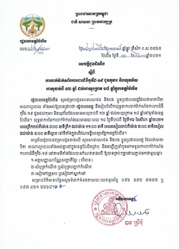 សេចក្តីជូនដំណឹងស្តីពីការចាក់វ៉ក់សាំងការពារជំងឺកូទី៩-១៩ ជូនកុមារ និងយុវវ័យ អាយុចាប់ពី ១២ ឆ្នាំ ដល់អាយុក្រោម ១៨ ឆ្នាំក្នុងខេត្តប៉ៃលិន